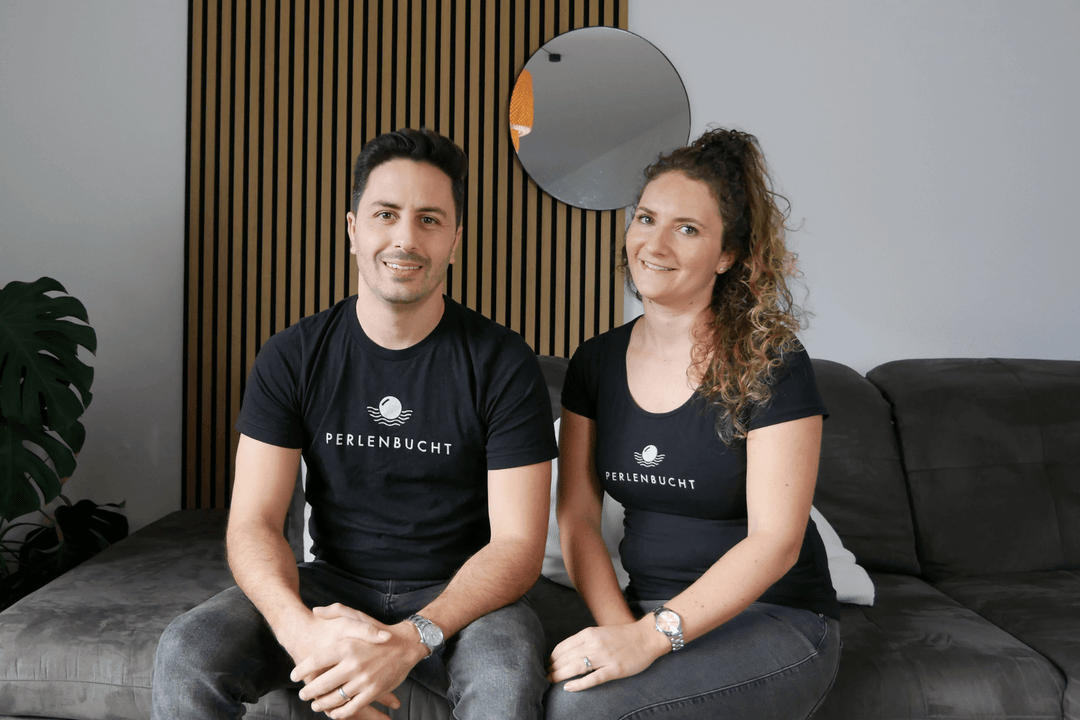 Federico und Elena, die Gesichter hinter PERLENBUCHT. Wir sind verheiratet und haben mittlerweile einen kleinen Sohn, der auf dem Foto noch etwas versteckt ist. Unsere Gründungsidee entstand durch Elenas vergebliche Suche nach der perfekten Lösung für ihre Hautprobleme...